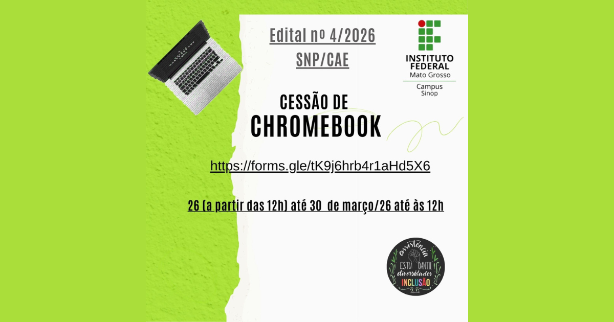 O IFMT Campus Sinop publicou o Edital nº 04/2026, que trata do processo seletivo interno simplificado para a cessão de Chromebooks a estudantes do ensino médio integrado no ano letivo de 2026.