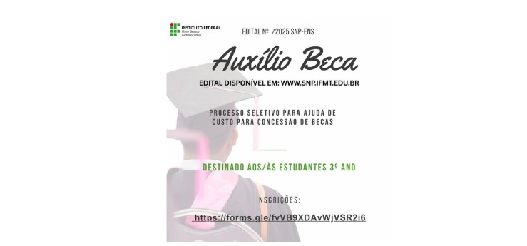 O Instituto Federal de Educação, Ciência e Tecnologia de Mato Grosso (IFMT) – Campus Sinop torna público o Resultado Final do Edital de Auxílio Beca, destinado aos estudantes regularmente matriculados, conforme critérios e procedimentos estabelecidos no referido edital.