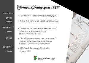 O IFMT Campus Sinop realizará, nos dias 04, 05 e 06 de fevereiro de 2026, a Semana Pedagógica 2026, no próprio campus, reunindo docentes, técnicos administrativos e equipe pedagógica em um momento estratégico de planejamento, formação e alinhamento institucional para o início do ano letivo.